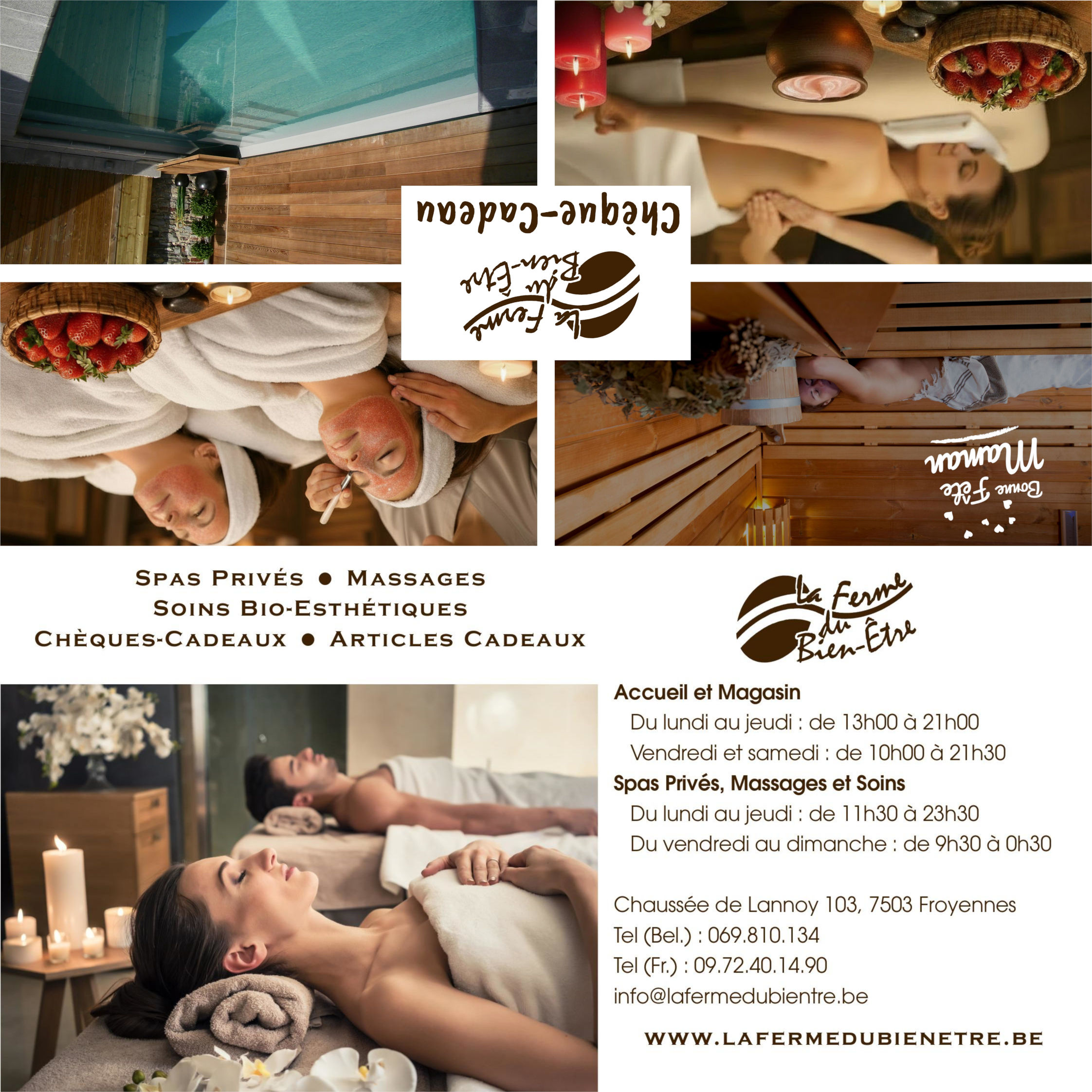 La Ferme du Bien-Être vous propose un unvivers thermal dans un cadre authentique qui incarne le bien-être dès le seuil franchi. Vous voyagerez parmi nos destinations bien-être, au coeur des meilleurs rituels bien-être combinant sauna, hammam, balnéothérapie et massages. Une palette complète de soins du corps et du visage à base de produits naturels complètent judicieusement cette invitation à la relaxation. Nos trois espaces de thalassothérapie (sauna, hammam, balnéothérapie, espace douches, espace de relaxation, piscine extérieure chauffée) se louent exclusivement en usage privé.